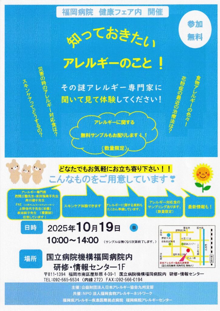 以下の日程で、国立病院機構福岡病で、アレルギーの健康フェアが行われます。(参加費無料)